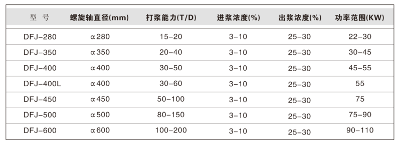 DFJ系列双螺旋挤浆机分双螺旋同向旋转和双螺旋异向旋转两种形式。低浓度浆料从进料口进入螺旋腔中,通过双螺旋轴的旋转,浆料被从进料端推向出料方向。同时由于螺旋轴的螺距由大变小和螺旋根径由细逐渐增粗,故浆料在运动中受到连续的挤压,从而使挤压出的液体通过包裹螺旋片的筛板孔眼挤出,被挤干的浆料则由出料口排出。